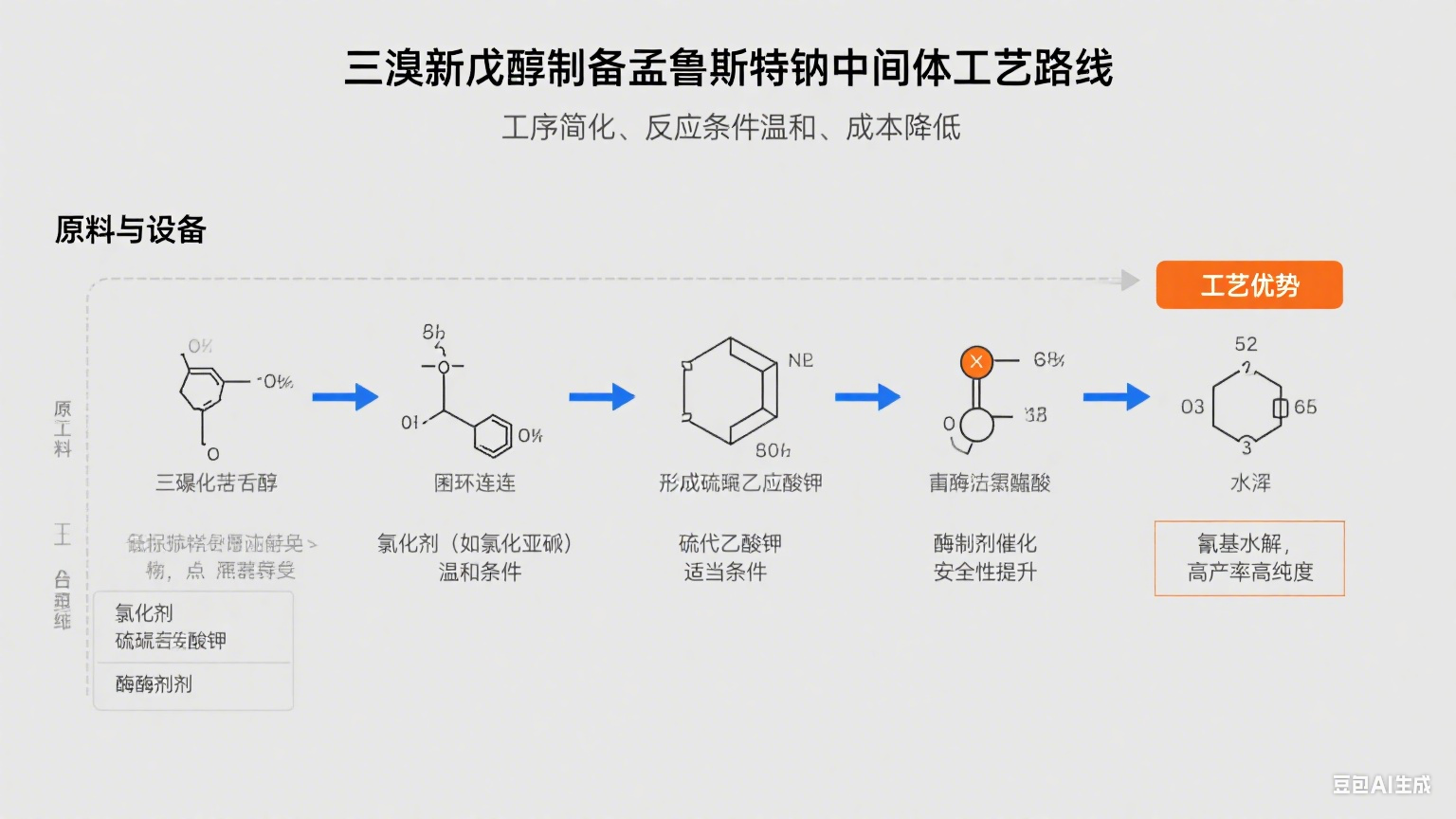 孟魯斯特鈉(Montelukast Sodium)是一種用于治 療哮 喘和過敏性鼻炎的有 效**,其中間體的制備對其** 終產(chǎn)物的質(zhì)量和生產(chǎn)成本具有重要影響。本文介紹了一種通過三溴新戊醇合成孟魯斯特鈉中間體的工藝方法。與傳統(tǒng)方法相比,該工藝具有工序簡化、反應(yīng)條件溫和、原料成本降低等優(yōu)點,為孟魯斯特鈉的工業(yè)化生產(chǎn)提供了一條高 效、經(jīng)濟的路線。