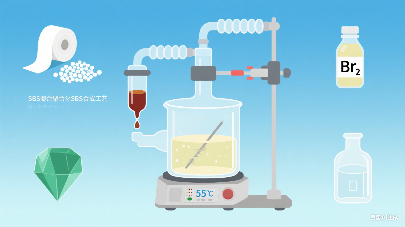 在溶液中加入適量的溴素(Br?),開始溴化反應(yīng)。該反應(yīng)通常在一定溫度下進(jìn)行,常見的反應(yīng)溫度為40-70°C。在反應(yīng)過程中,溴分子與SBS中的不飽和雙鍵發(fā)生加成反應(yīng),生成溴化SBS。