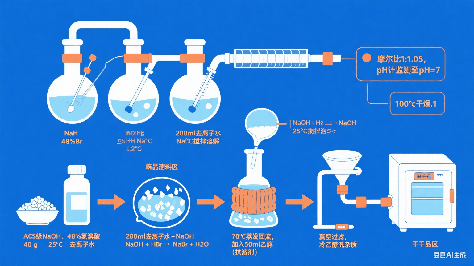 然后,將過(guò)濾后的溴化鈉晶體在100°C的干燥箱中干燥12小時(shí)。此步驟確保去除任何吸附的水分,得到無(wú)水產(chǎn)品。